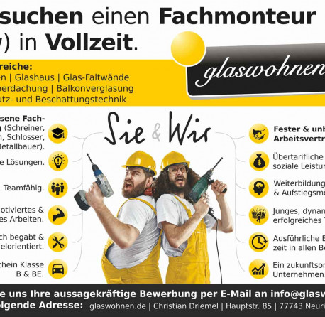 Sie haben eine erfolgreich abgeschlossene Fachausbildung als Schreiner, Zimmermann, Schlosser oder Metallbauer. Sie sind motiviert, handwerklich begabt und geschickt im Umgang mit Kunden. Sie montieren selbständig oder zusammen im Team RWA-Systeme, Fenster, Türen, Wintergärten, Faltwände u.Ä.