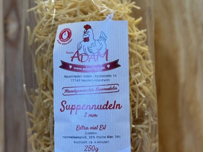 Diese Suppennudeln sind dünn geschnitten und eignen sich gut für klare Brühen und leichte Eintöpfe. Der hohe Ei-Anteil sorgt für einen runden Geschmack und eine stabile Konsistenz.