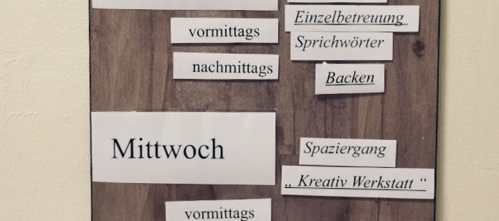 - Vielfältige Einzel- und Gruppenangebote wie Gymnastik, Spiele, Basteln, Singen, Backen und Kochen, Biographiearbeit, basale Stimulation und Spaziergänge