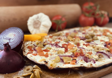 Selbstverständlich gibt es auch eine vegane Variante unserer knusprigen Flammenkuchen. Diesen gen...