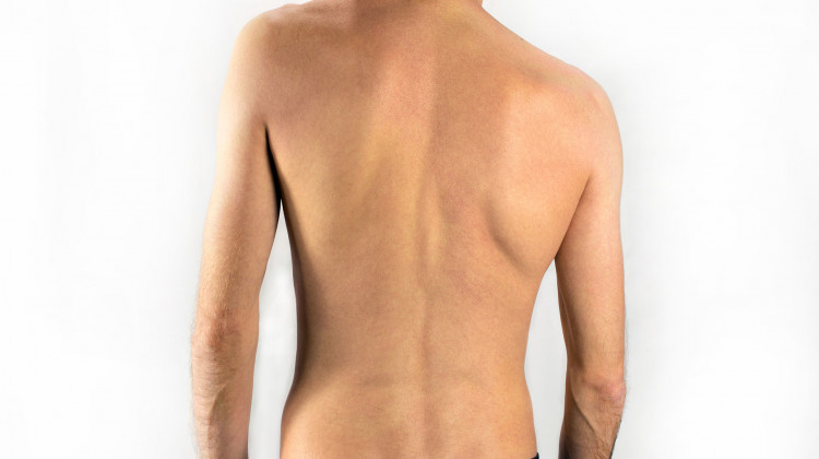 - Körper neigt sich zu einer Seite, ungleiche Schultern, ein Schulterblatt ragt heraus.