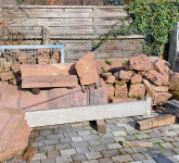Im Lager findest du vor allem roten Sandstein in vielen Varianten und Maßen. Granit und weitere Steine liegen ebenfalls bereit.