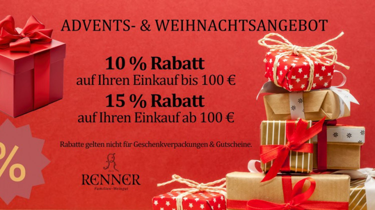 Profitieren Sie jetzt von attraktiven Preisvorteilen. Sie erhalten 10 Prozent Rabatt auf Ihren Einkauf bis 100 Euro. Ab einem Einkaufswert von 100 Euro sichern Sie sich 15 Prozent Rabatt. So lohnt sich auch der größere Weineinkauf für die Feiertage.