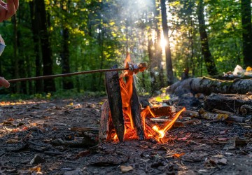 Wintergrillen mit Waldspeck am offenen Feuer.